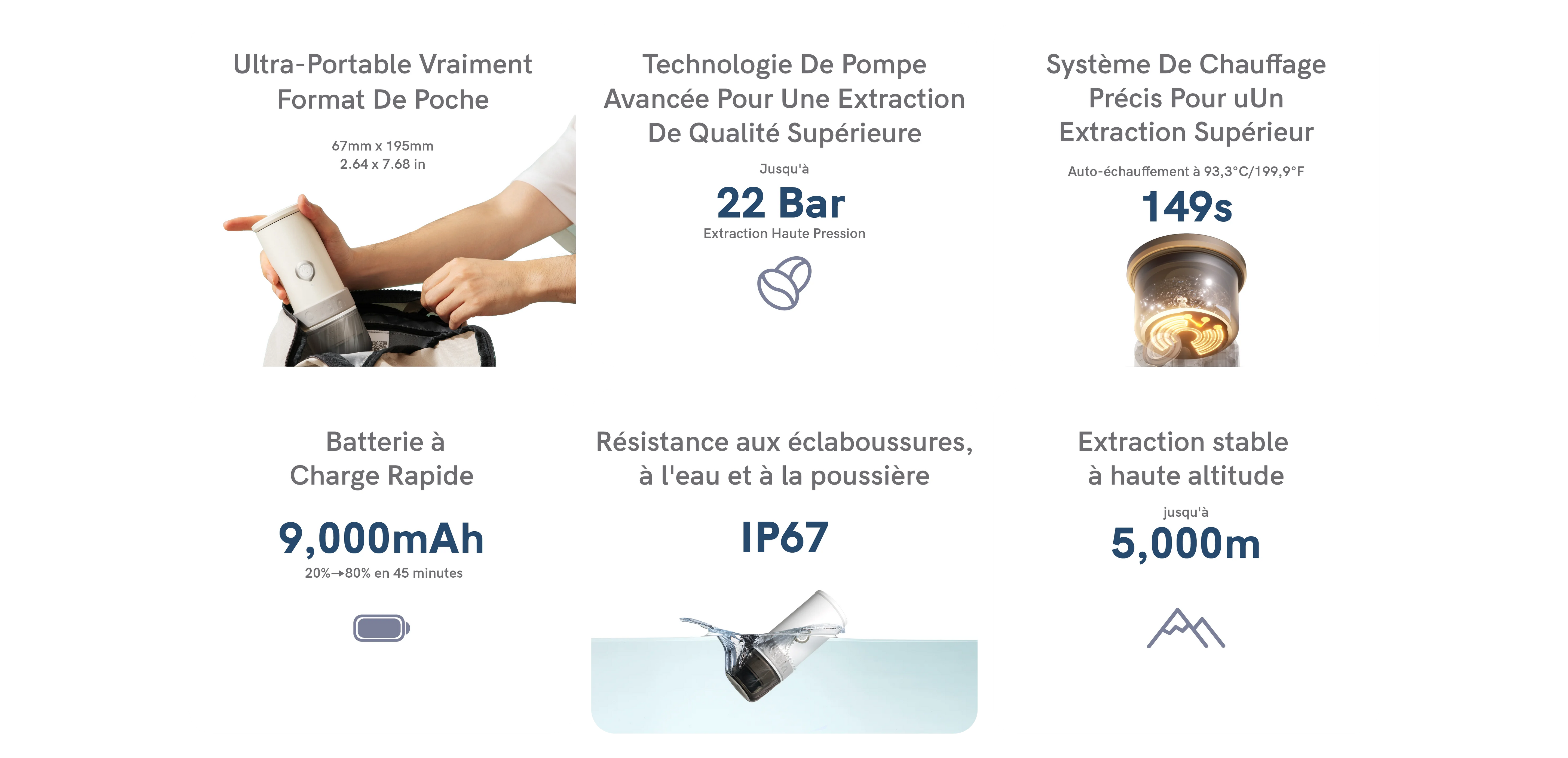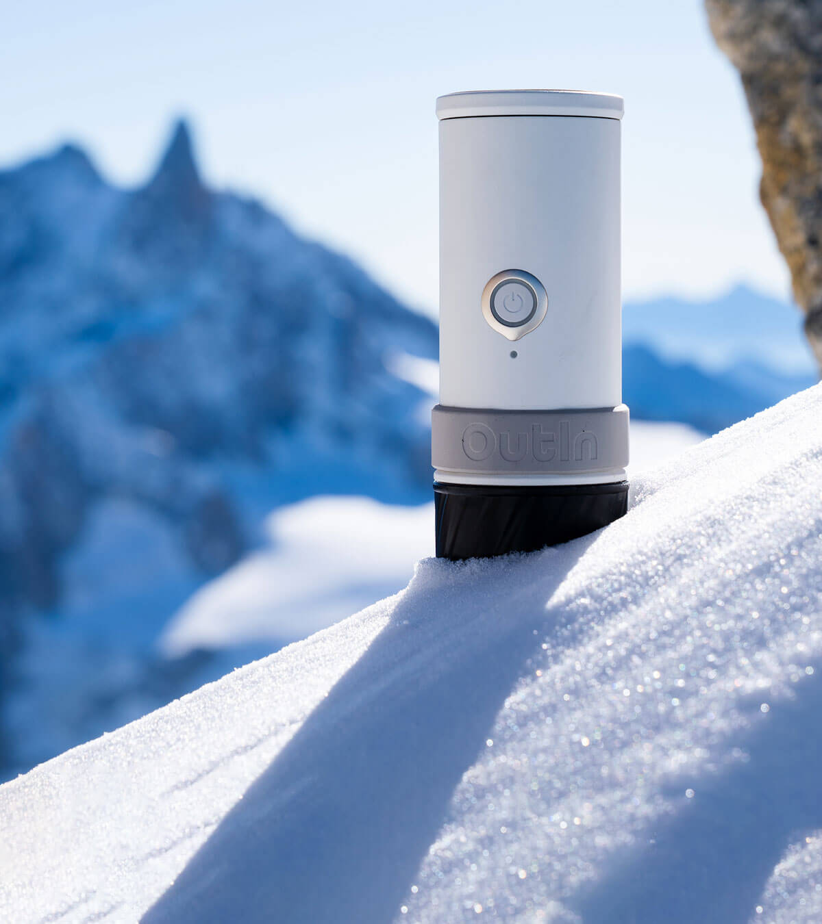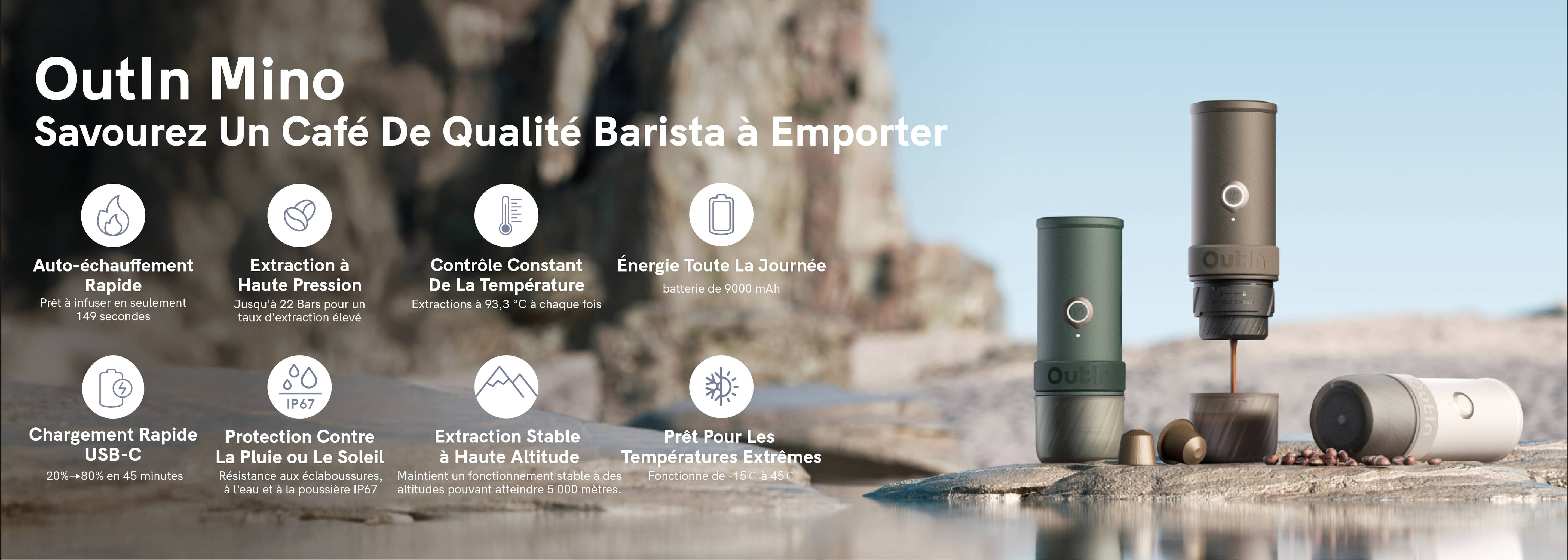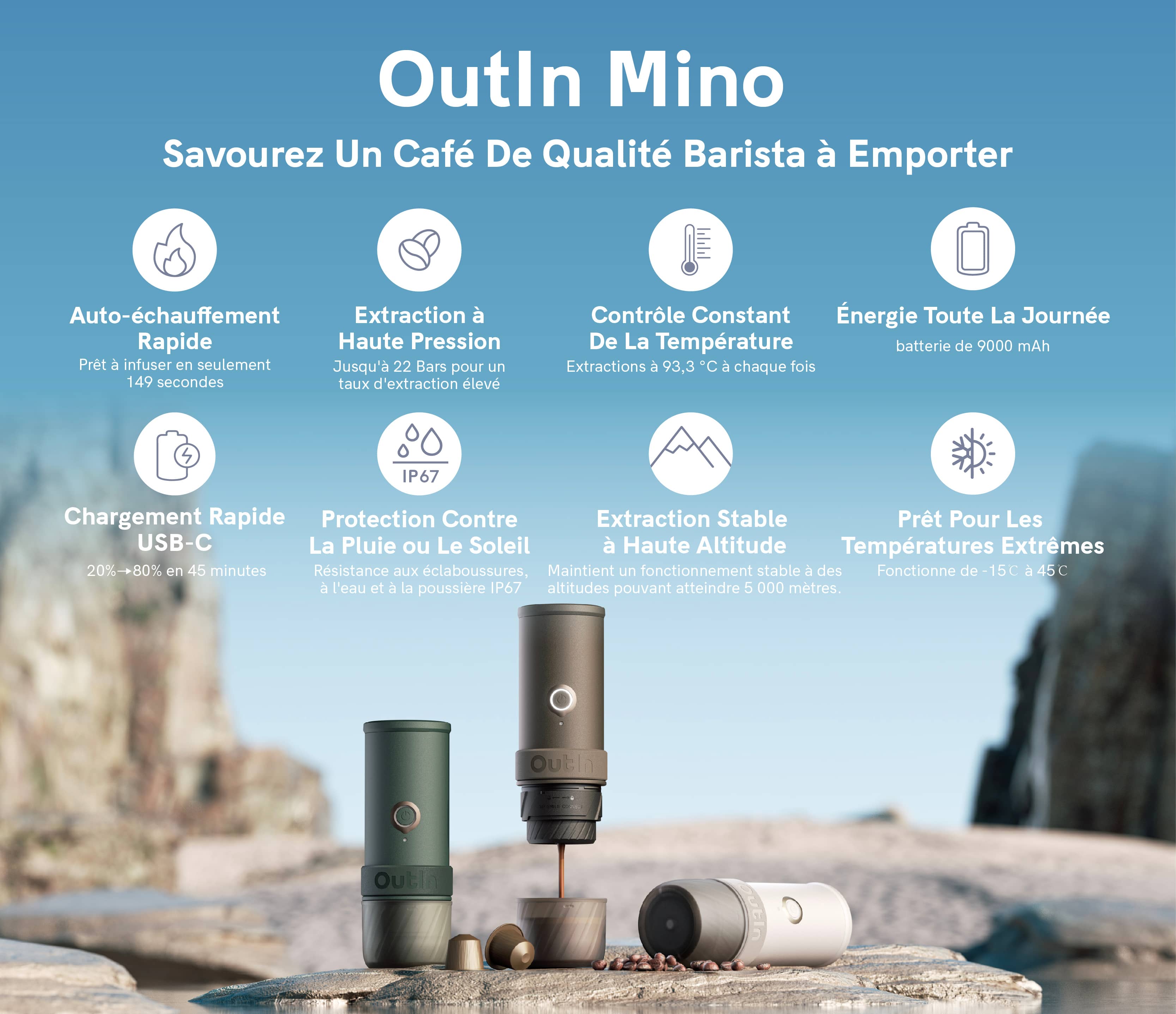 L'OutIn Mino, quant à lui, est conçu pour les amateurs de nature. Des déserts aux sommets des montagnes en passant par les jungles profondes, c'est votre café portable paré pour l'aventure. Équipé d'une pression de 22 bars et d'une pompe spécialement conçue, le Mino offre une extraction de café digne d'un barista sans aucun accessoire supplémentaire. Dès sa sortie de l'emballage, le Mino est prêt à vous accompagner dans de nouvelles aventures. Nous croyons que la simplicité est essentielle.