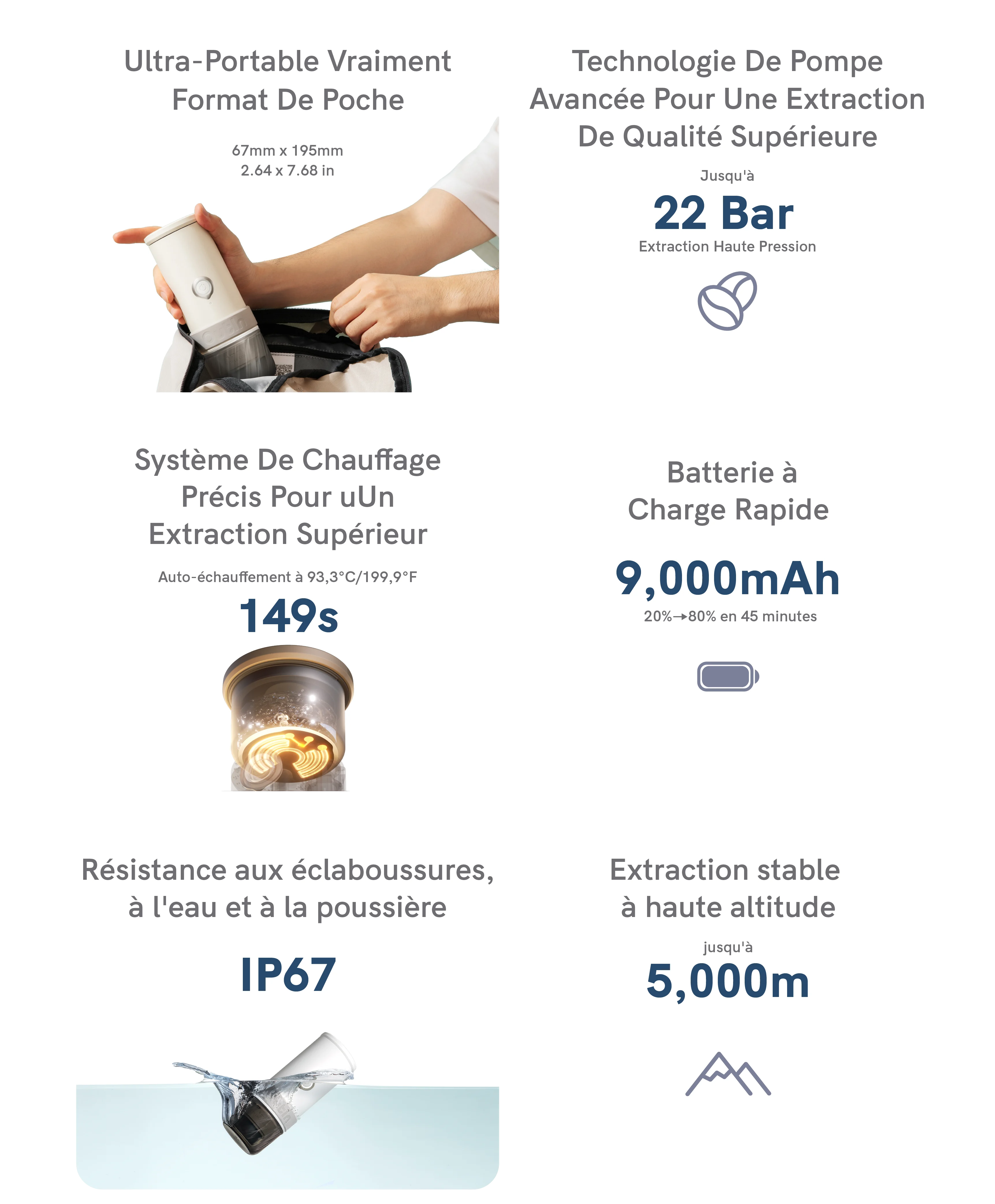 Une puissante batterie de 9 000 mAh offre plus de tasses par charge. La charge rapide USB-C vous permet de passer de 20 % à 80 % en 45 minutes et d'atteindre la pleine puissance en environ 90 minutes.