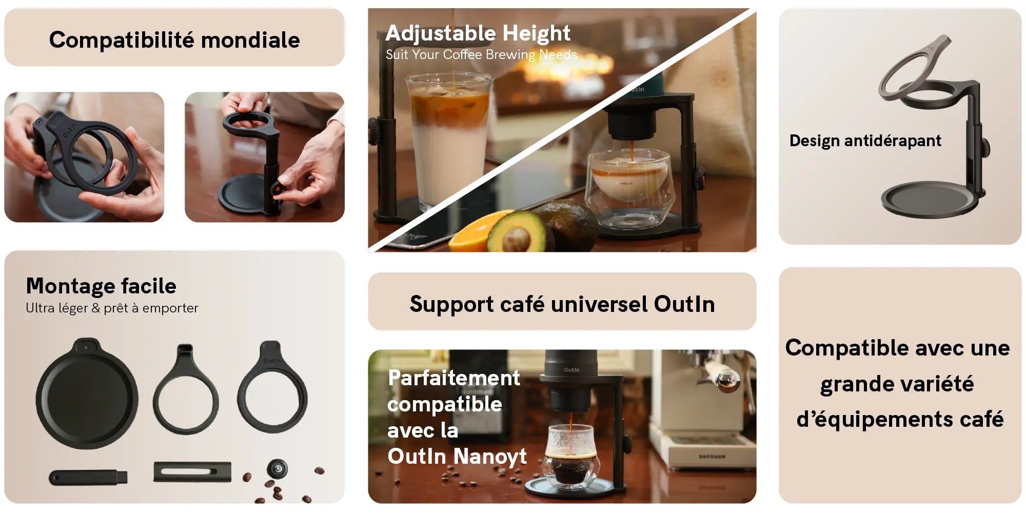 Conçu pour s’adapter à une large gamme d’équipements café — du dripper au moulin portable — le support café universel OutIn offre une expérience d’infusion stable et mains libres. Il est aussi parfaitement compatible avec la OutIn Nano.